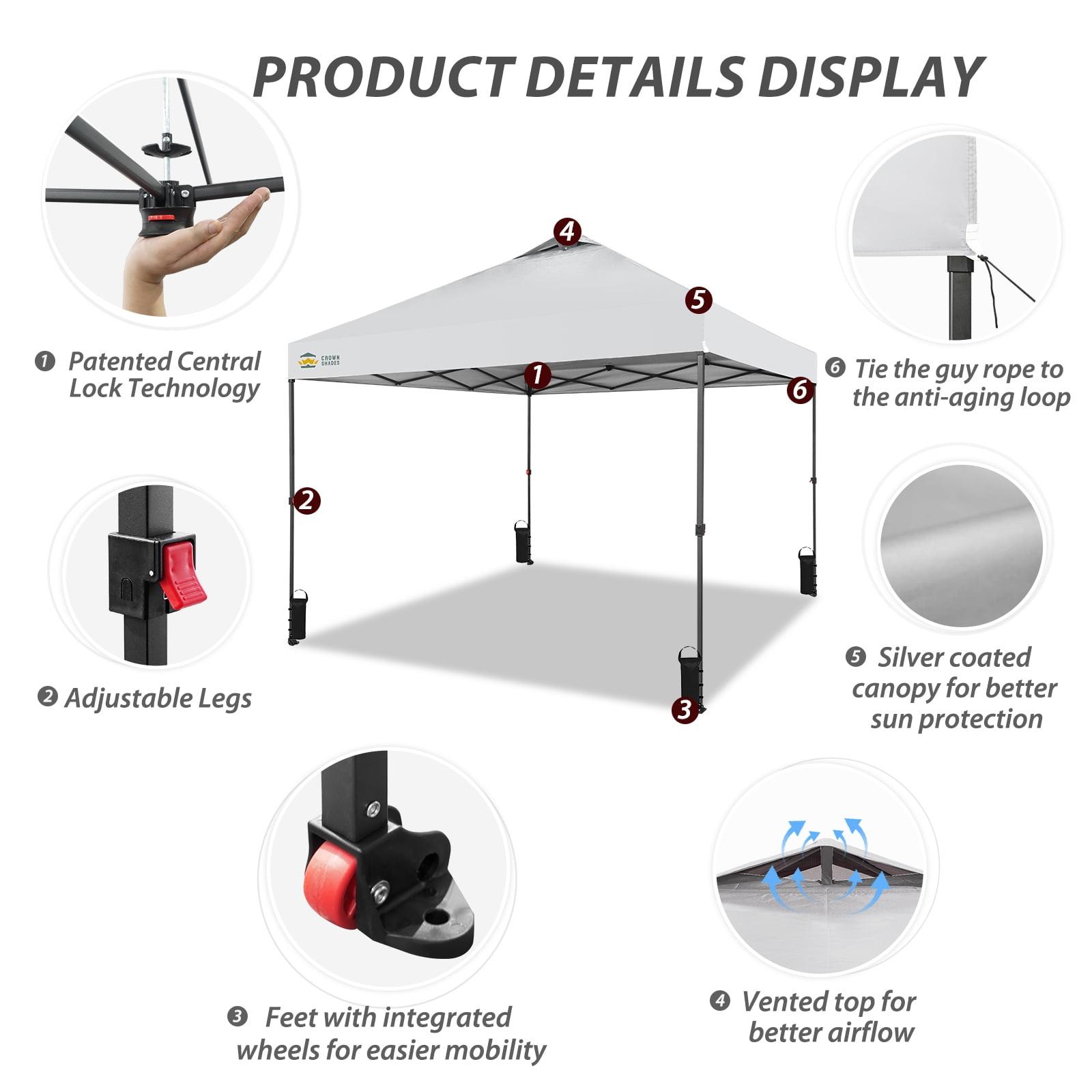 Our 10x10 pop up canopy tent features patented one push center lock tech. With just a single push, the central hub locks the poles in place. Designed for the next generation, this outdoor canopy for patio can be set up by two people in seconds without any tools. Three adjustable height settings with soft, pinch-free buttons ensure convenience and safety, making it perfect for camping, beach outings, craft fairs, tailgating, farmer markets, outdoor BBQs, and more.