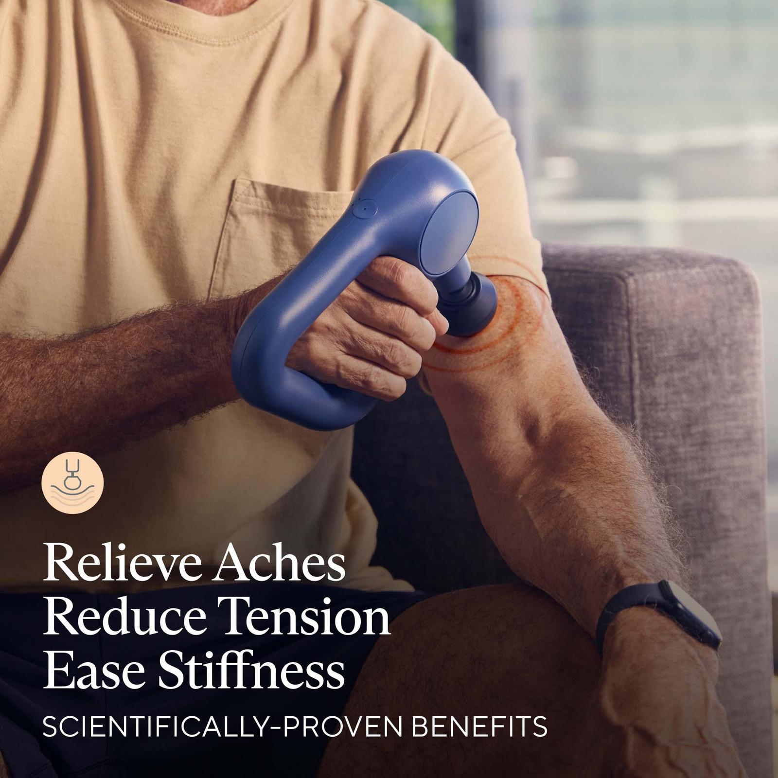 Feel better throughout the day with Theragun Relief, your go-to percussive massage device for everyday comfort. Comfortable and light, Theragun Relief is our most easy-to-use device using scientifically proven percussive massage therapy to provide fast and effective relief from daily aches, pains, tension, and stiffness. The patented triangle grip helps get to those hard-to-reach spots and 3 specialized attachments help treat everything from large muscles to tender, sensitive areas. Theragun Relief makes it easier than ever to feel better and stay active.Designed with strict quality and safety standards, Theragun Relief is an FDA registered medical device.Science-Backed Benefits:Relieve achesReduce tensionEase stiffnessProduct FeaturesFast, effective massage therapy for everyday reliefTheragun Relief integrates our most comfortable percussive massage therapy with 3 unique attachments, designed to target different types of muscle pain, from aches and tension to stubborn knots. The quiet motor provides a comfortable massage experience without any excess noise. Comfortable 10mm percussive massage therapyTheragun Relief uses comfortable, circulation-boosting 10mm percussive massage therapy to effectively relieve daily aches and pains. Designed to provide an ultra- comfortable massage experience, it is perfect for those who prefer a slightly milder, soothing massage. Simple. Light. Easy to use.With easy, one-button control, Theragun Relief is the simplest design yet. Light and effective, it's daily relief at the touch of a button.Patented triangle grip to reach more of your body than other devices Theragun Relief features our easy-to-use patented triangle grip, so you can comfortably reach anywhere on your body without help from another person.3 scientifically-designed attachments to treat different areas of your bodyTheragun Relief includes 3 unique attachments, designed to target different types of muscle pain:Standard Ball - All-over body massage to reduce tension.Dampener - Reduce aches and pains for tender or sensitive areas.Thumb - Lower back and trigger points to ease painful knots.What's Included:Theragun Relief device3 massage attachments:Standard BallDampenerThumbUSB-C charging cable