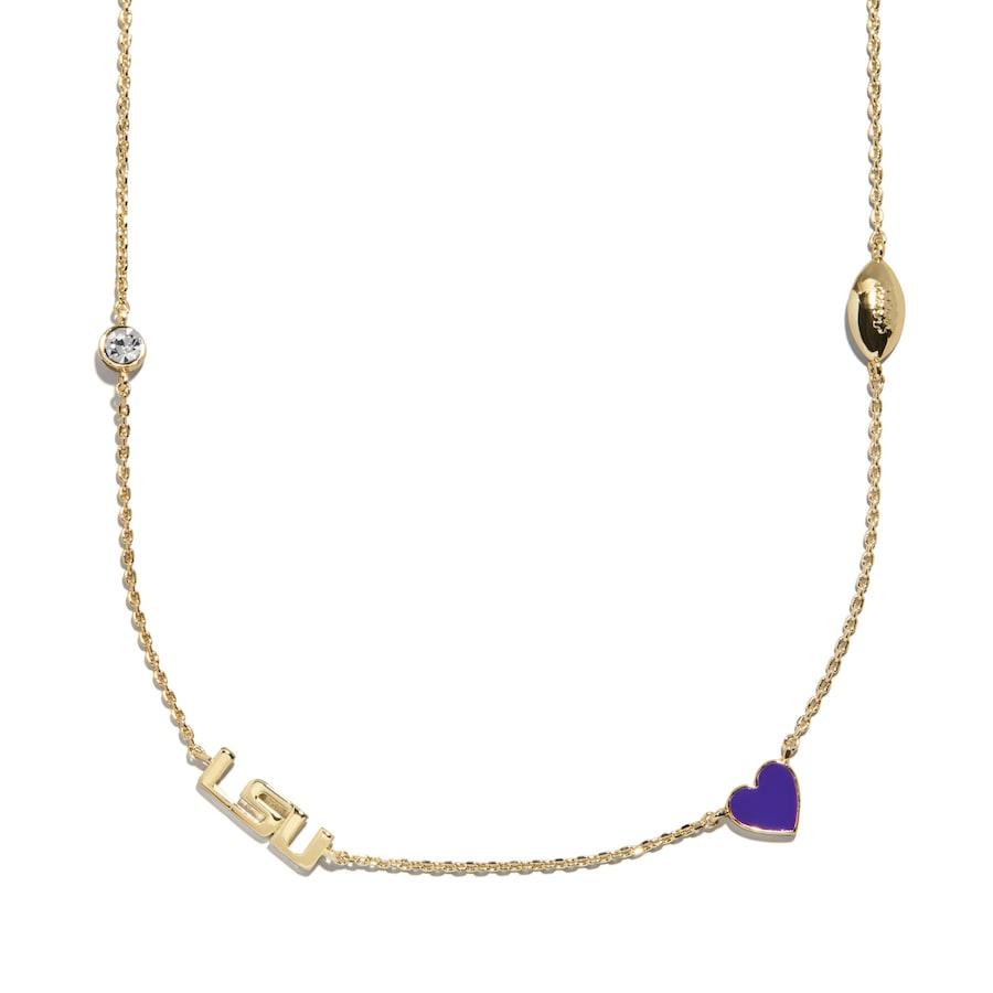 Express your LSU Tigers pride in elevated fashion with this Delicate Spaced Charm Necklace crafted by BaubleBar. Its four charms feature the team logo, a clear stone, a heart in the school color and a football. Hypoallergenic gold-plated brass makes this dainty piece of jewelry an ideal choice for sensitive skin while showing off your school pride.