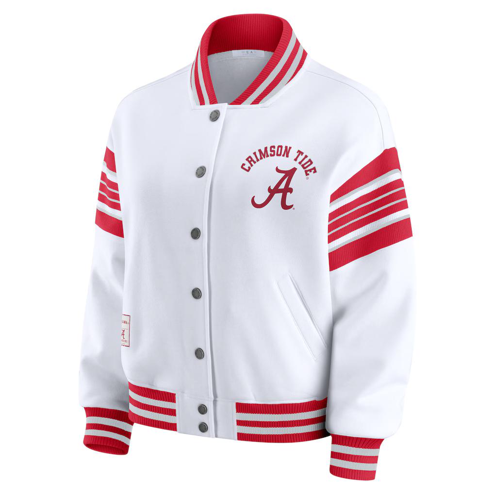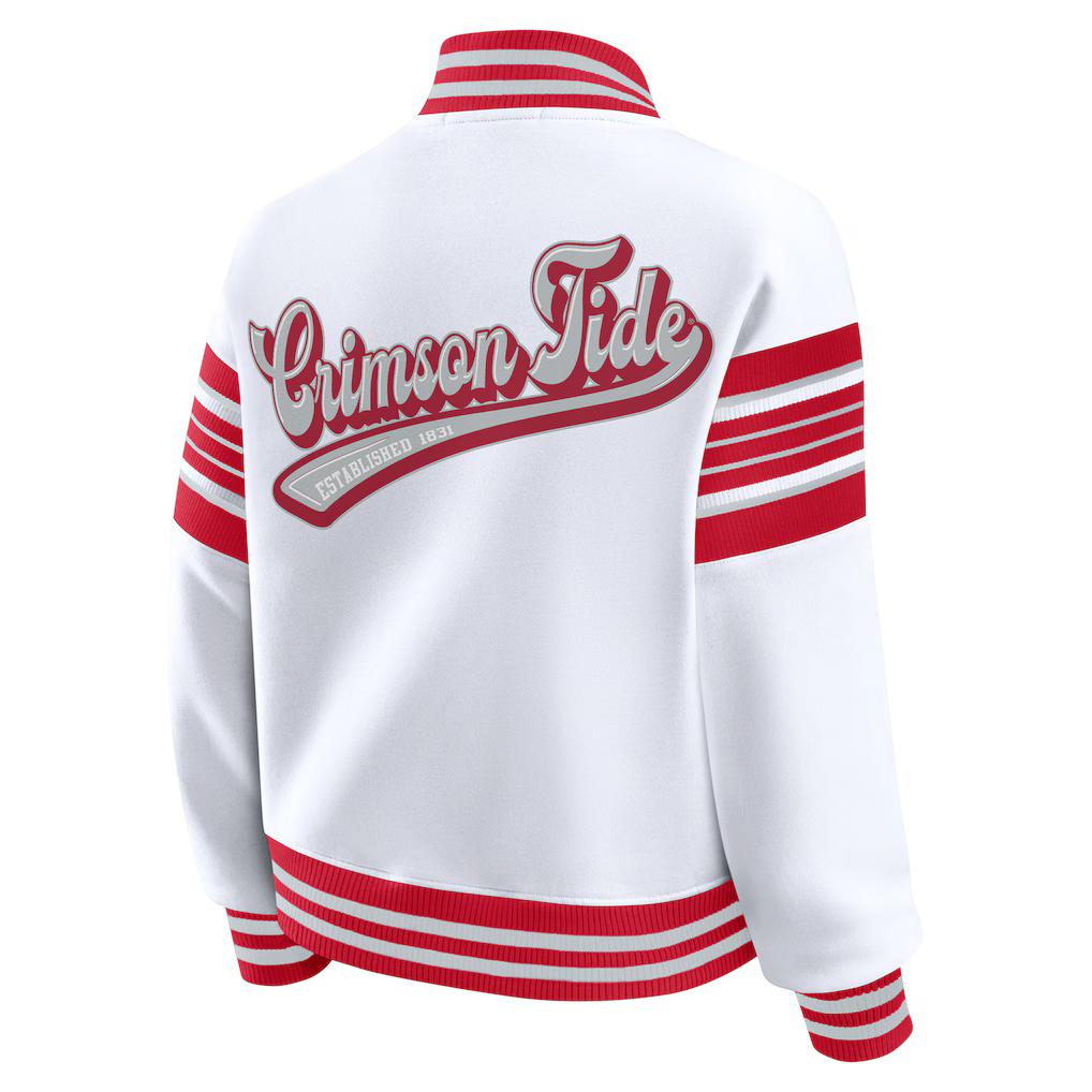 Show your Alabama Crimson Tide team spirit with a dash of retro style in this Satin Stitch Full-Snap Fleece Sweatshirt Jacket from WEAR by Erin Andrews. The satin stitch detailing and bold team graphics add a touch of elegance, making it a standout piece in your game day wardrobe. The midweight design is perfect for moderate temperatures, keeping you cozy and stylish while you cheer on the Alabama Crimson Tide.
