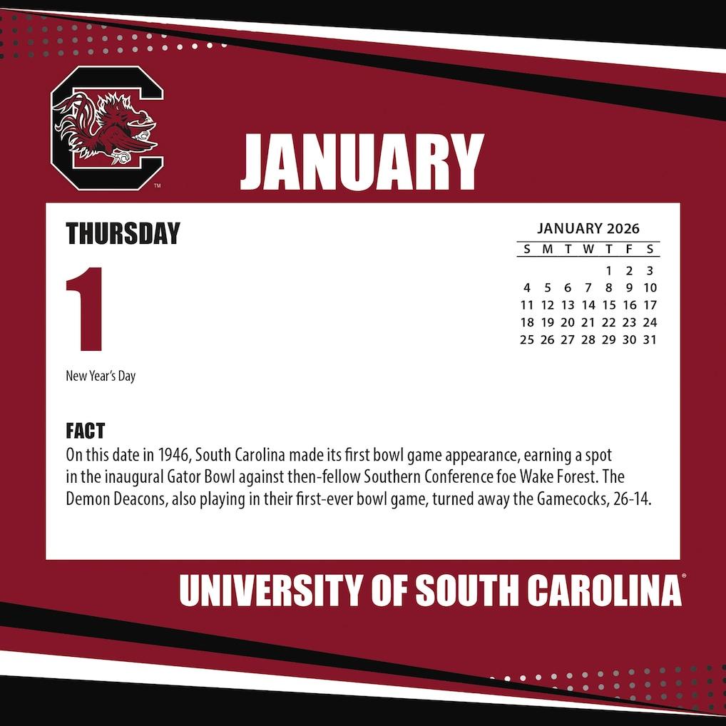 Stay organized and show your South Carolina Gamecocks pride all year long with this 2026 Box Calendar. The 16-month calendar includes bonus pages for September through December 2025, allowing you to plan well into the future. Plus, each page features a fact or trivia tidbit, so you can learn something new about the South Carolina Gamecocks every day.