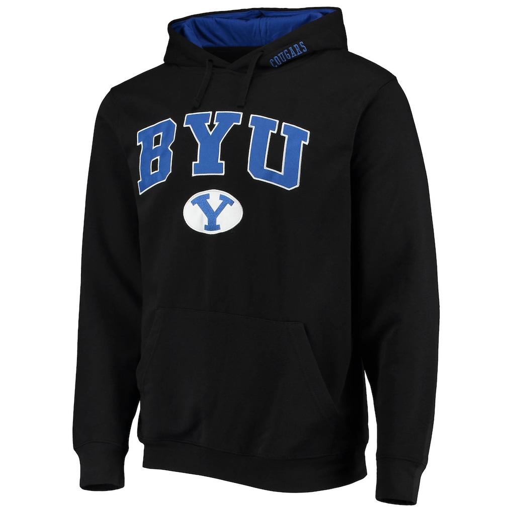 The Men's Colosseum Black BYU Cougars Arch & Logo 3.0 Pullover Hoodie is the ultimate way to show your unwavering support for the BYU Cougars. This midweight hoodie features a cozy fleece lining, perfect for chilly game days. The embroidered fabric applique and contrast-color hood lining add a touch of style, while the front pouch pocket provides convenient storage for your essentials. Whether you're cheering from the stands or simply showing your BYU Cougars pride, this hoodie is a must-have for any devoted fan.