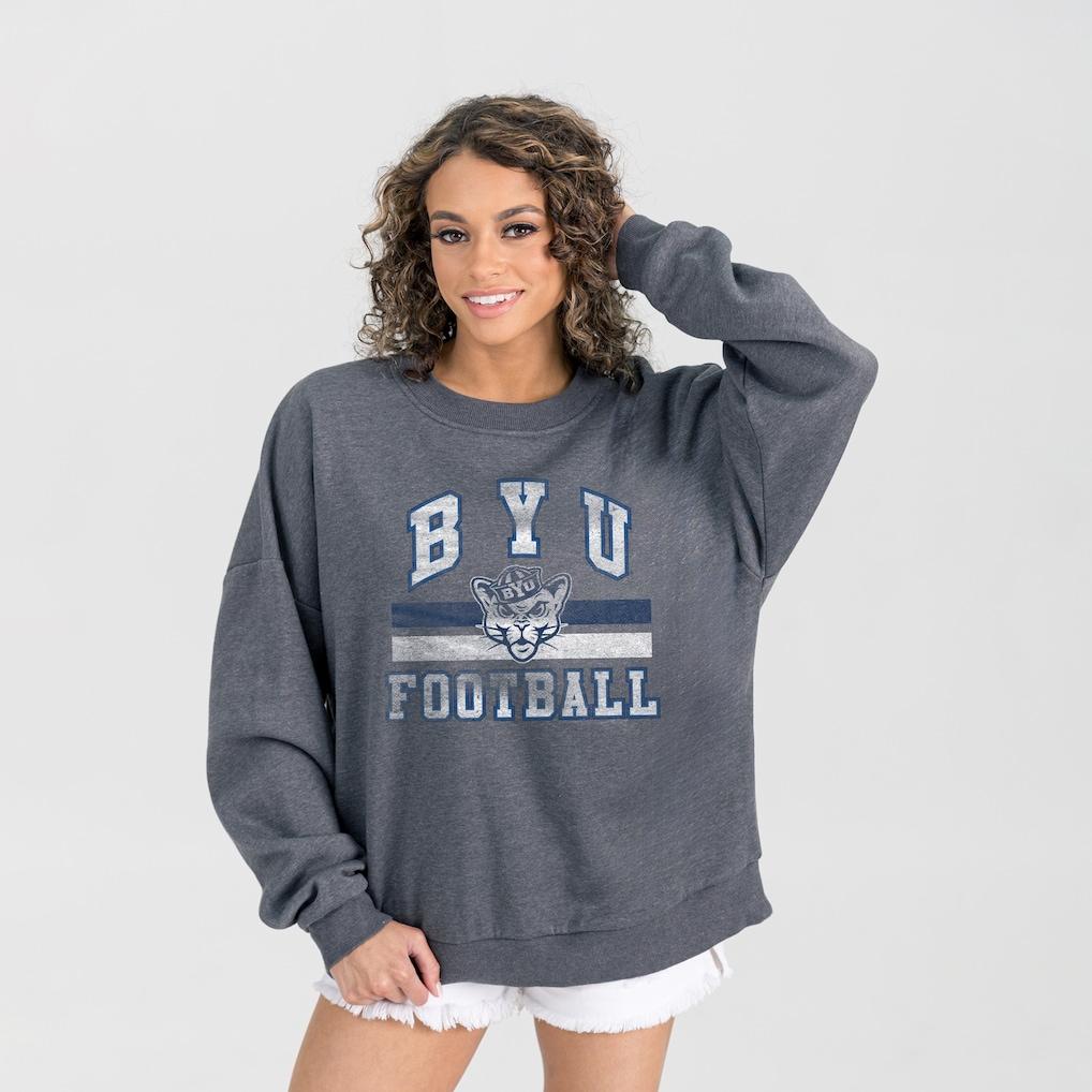 Stay cozy and showcase your school spirit with this BYU Cougars Oversized Good Vibes Premium Fleece Drop Shoulder Pullover Sweatshirt from Gameday Couture. The dropped shoulder seams provide a relaxed and oversized fit, perfect for lounging or layering. The distressed screen print graphics add a vintage touch, showcasing your BYU Cougars pride in style.