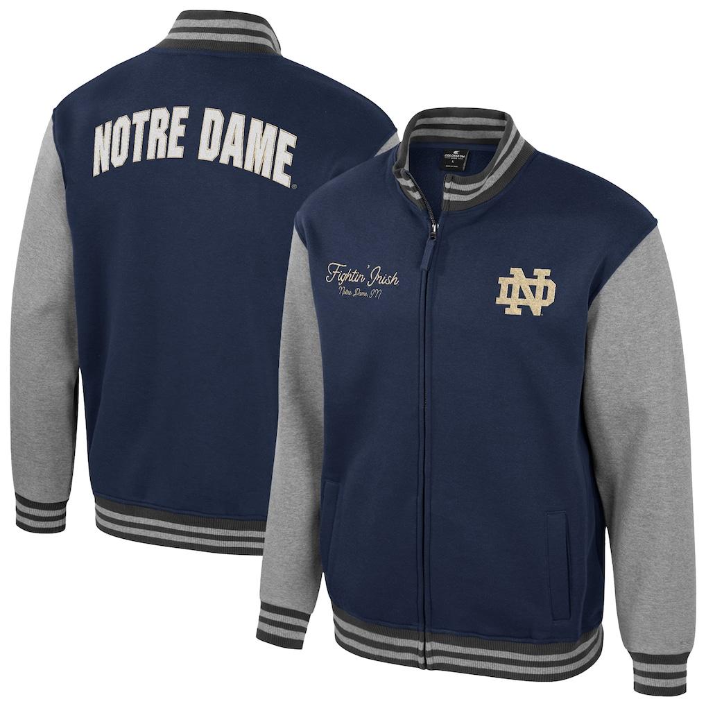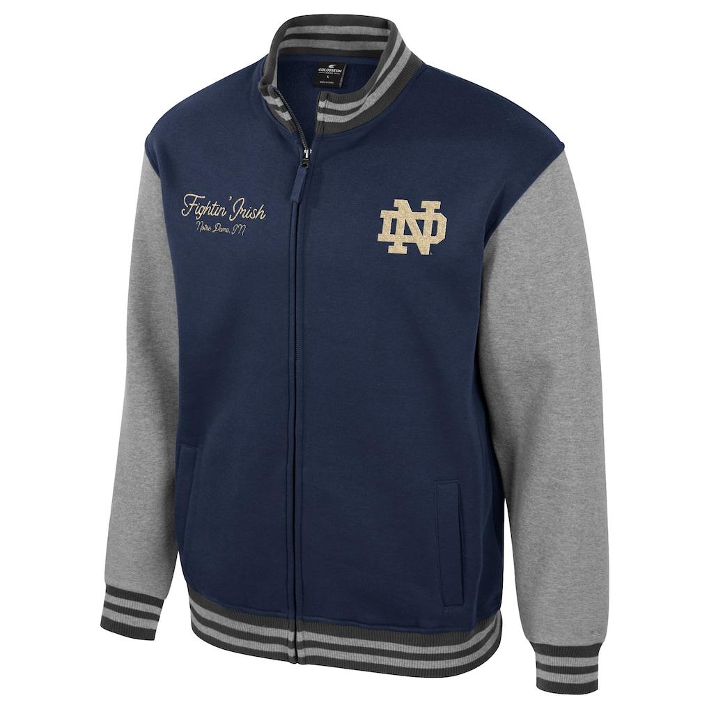 Show off your Notre Dame Fighting Irish pride with this Colosseum Ambi-Turner Full-Zip Varsity Jacket. This varsity jacket features a classic design with embroidered team details on the chest, showcasing your Notre Dame Fighting Irish pride. Constructed from durable polyester, this midweight jacket is perfect for moderate temperatures, keeping you comfortable at the game or around town.