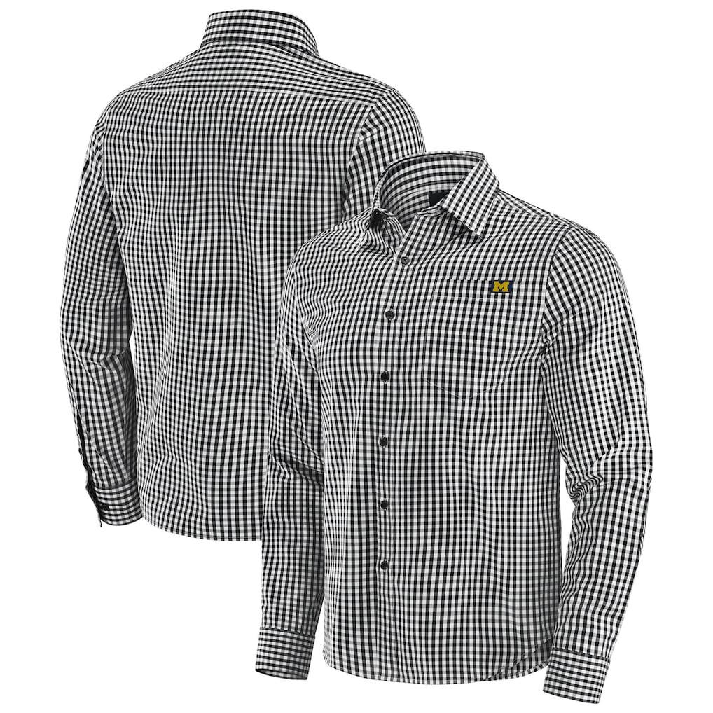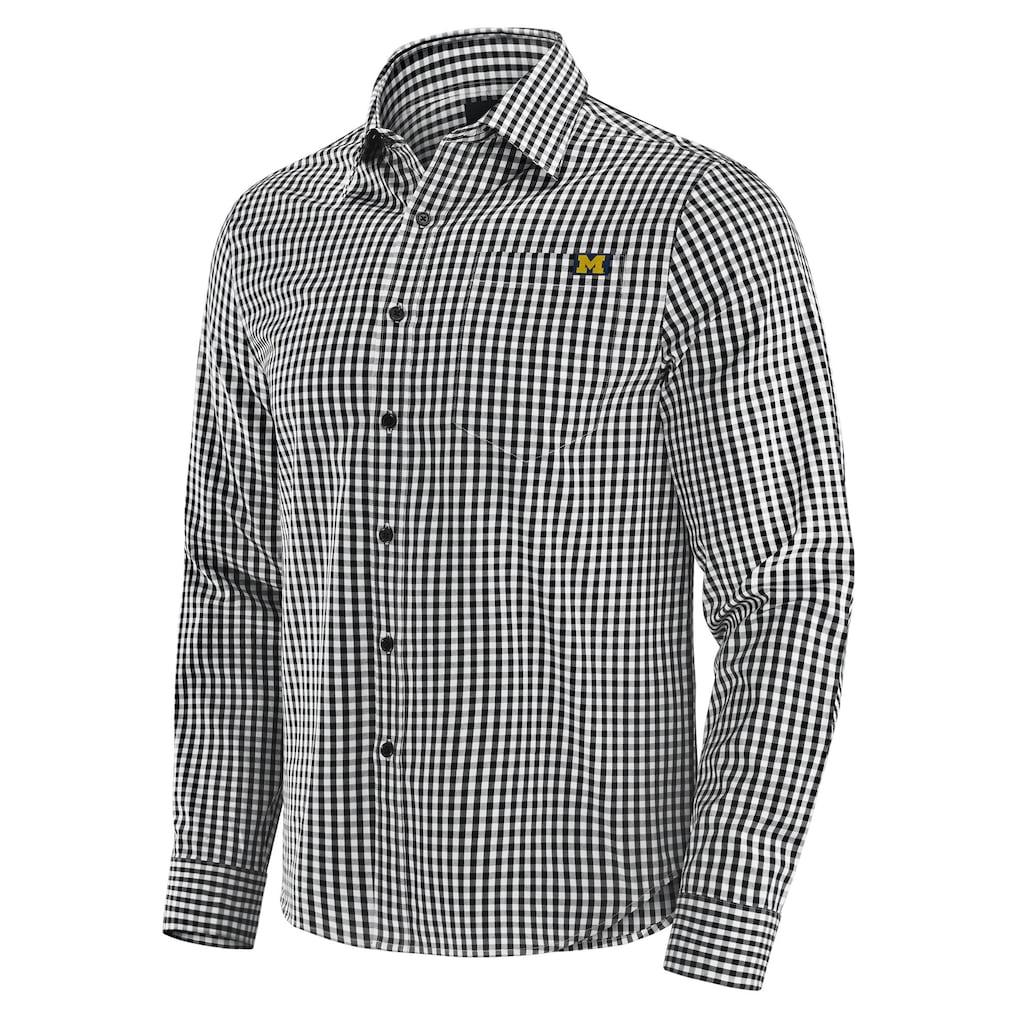 Seamlessly transition from work to play in this Michigan Wolverines Dual Threat Long Sleeve Button-Up Shirt. Designed by J. Palmer, its classic gingham pattern and crisp style provide a versatile look. Pair with the Man-In-Motion Blazer for a dressy ensemble, tuck into khakis and add a belt for a smart-casual vibe or roll up the sleeves and wear jeans to create a relaxed feel.