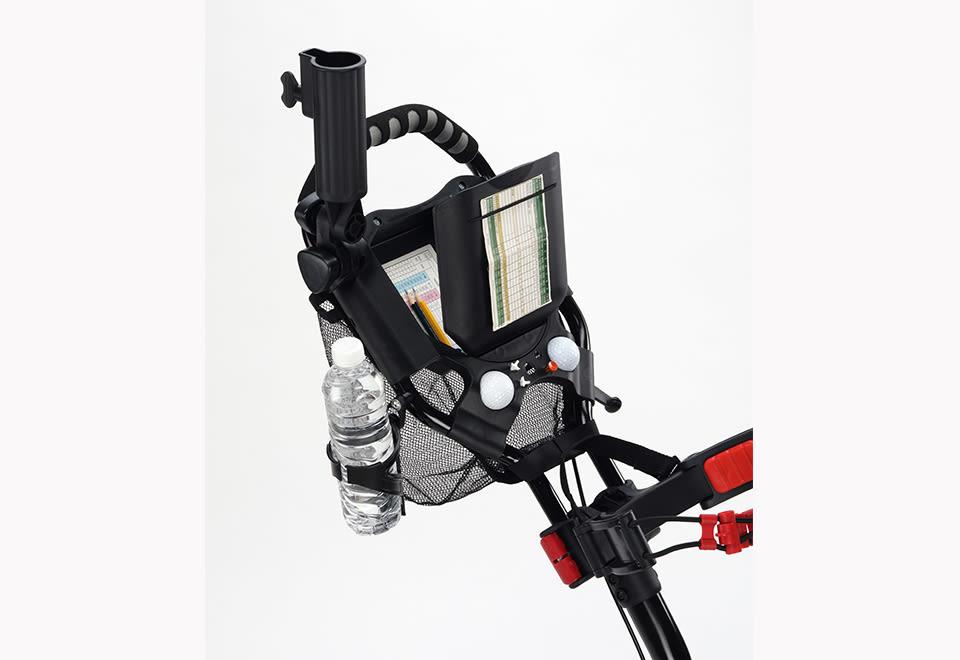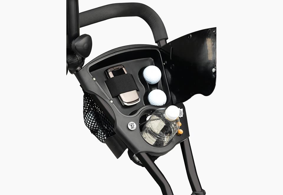 The Compact Golf Cart holds any size golf bag, yet folds up for easy transport and storage. Just press the EZ fold button to collapse and stow in a car trunk, shed or basement. Features a 360-degree front wheel, scorecard holder with storage compartment, beverage caddy, umbrella holder and mesh accessory pouch. The one-touch foot brake locks and unlocks the wheel without bending over. Some assembly required.