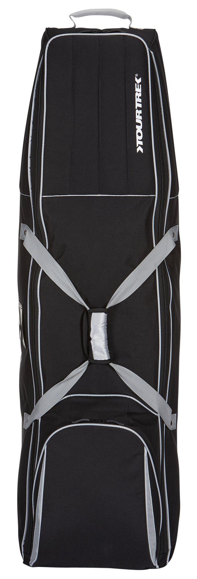 Designed to fit most stand and cart golf bags, the TourTrek TC PRO Travel Cover features 360° padding to protect club heads, full-length horseshoe zippers for easy loading, and top handle/duffle straps for easy lifting. In addition, the durable base has in-line wheels for stability and maneuverability. Interior pockets, oversized external shoe bag and an integrated ID card holder provide additional storage. FEATURES: Soft side travel cover 360° padding protects club heads Dual, full length horseshoe zippers for easy loading Top handle and duffle straps for easy lifting 2 interior pockets for additional storage Oversized exterior shoe bag Durable base and in-line wheels for stability and maneuverability Lockable zippers Integrated ID card holder Central internal strap secures golf bag Designed to fit most stand and cart golf bags Dimensions: 14” L x 14” W x 52” H Weight: 6.6 lbs.