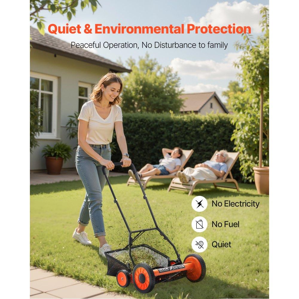 18" Manual Push Reel Lawn Mower 5-Blade Adjustable Height Grass Catcher 4 WheelsLarge WheelsU-Shaped HandleGrass Catcher BagQuick AssemblyVersatile UseEnvironment Protection & SilentBlade Material: UNS1566,Cutting Height Range: 1.37" - 2.44" / 35 - 62mm (9-Position Adjustment),Item Model Number: HS-GT1603B,Cutting Width: 18" / 450mm,Product Weight: 25.13 lbs / 11.4 kg,Number of Blades: 5,Product Dimensions: (L x W x H) 11.81 x 24.21 x 9.65 inches / 30 x 61.5 x 24.5 cm.
