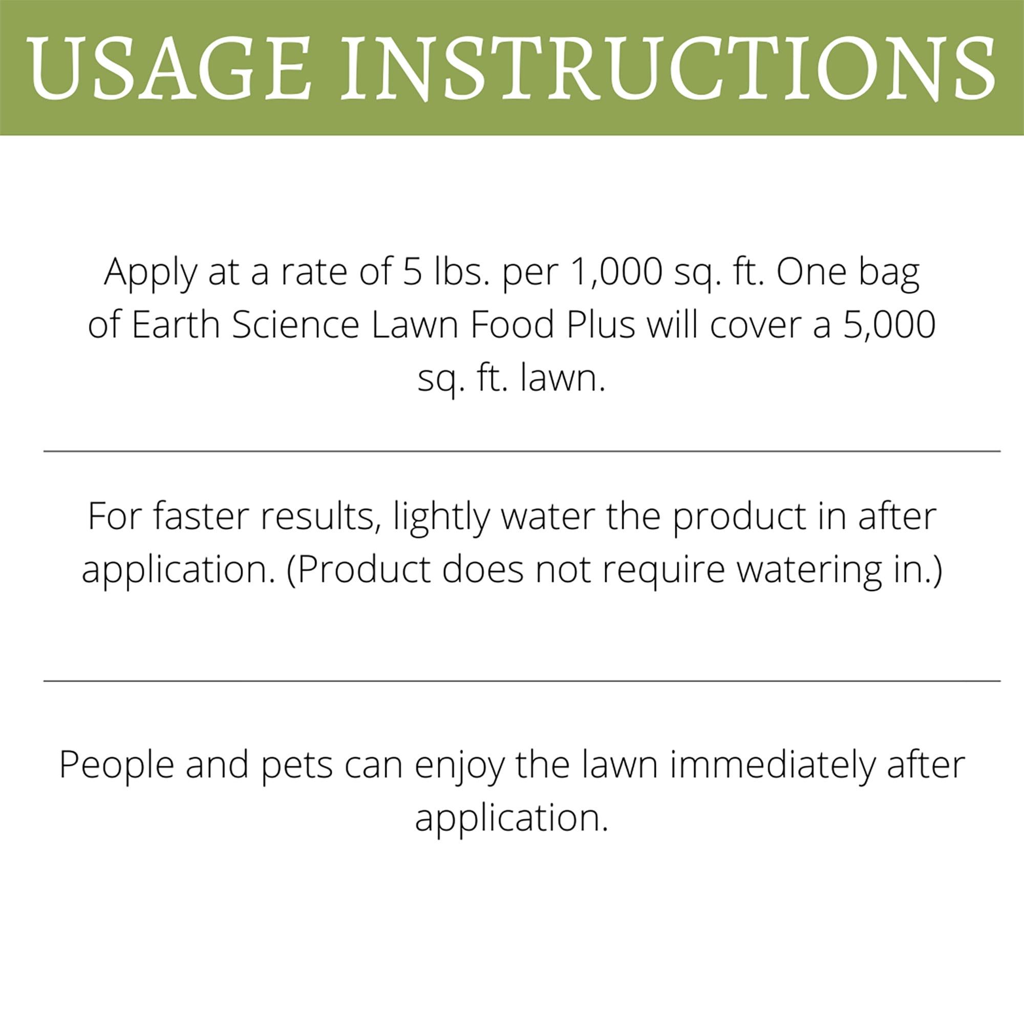 Earth Science Lawn Food Plus Natural Lawn Fertilizer 20 lb 5 000 sq.ft. Coverage is a natural fertilizer that helps repair soil & feed your lawn. Lawn Food Plus is as effective as synthetic fertilizers with the added benefits of adding organic matter (from dried dairy cow manure) calcium and other nutrients to the soil. Nutri-Bond technology holds nutrients in place for maximum effectiveness & reduction of nutrient run off. 1 application of Lawn Food Plus feeds the lawn & the soil all season long.