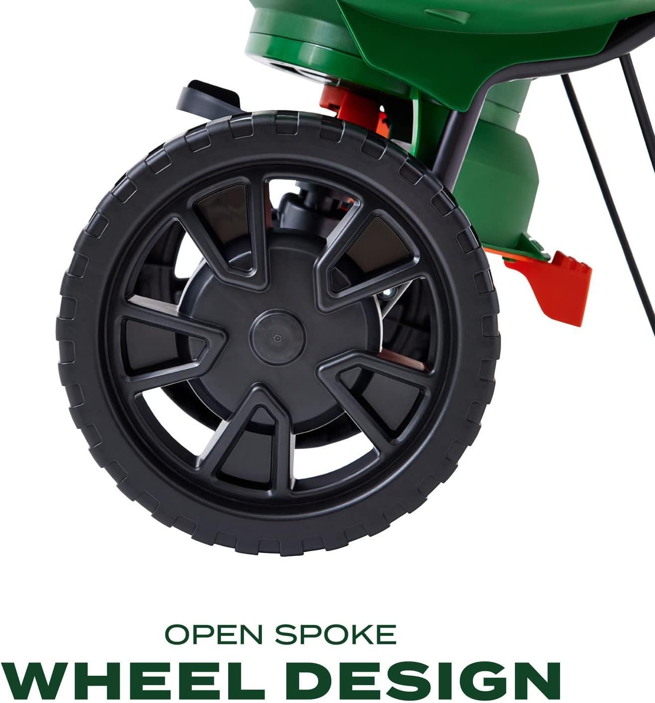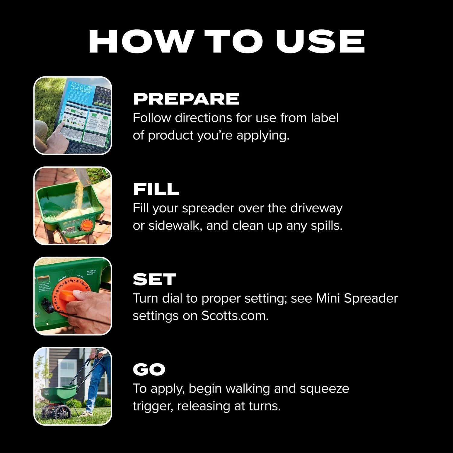 Use the Scotts® Turf Builder® EdgeGuard® Mini Broadcast Spreader to apply fertilizer, grass seed, salt and ice melt. This lawn spreader comes pre-calibrated and ready-to-use, and holds up to 5,000 sq. ft. of Scotts® product. When EdgeGuard™ is engaged, it will block off the right-side of the spreader pattern to prevent product from spreading onto non-lawn areas. Using the Scotts® Turf Builder® EdgeGuard® Mini Broadcast Spreader is simple. To begin, turn rate control dial to the correct setting listed on the back of each Scotts® product, pour the product in the hopper, then start spreading. The lawn spreader's design enhancements feature a curved hopper and dual-bladed agitator for smooth product funneling and consistent coverage. Not to mention, it is compact and features a fold-down handle for easy storage. Spreaders provide uniform coverage of granular products; without one, you may end up with uneven coverage of fertilizer or control products that can result in uneven feeding, weed, disease, or insect control. Scotts® spreaders can also be used to distribute salt on walkways and driveways.