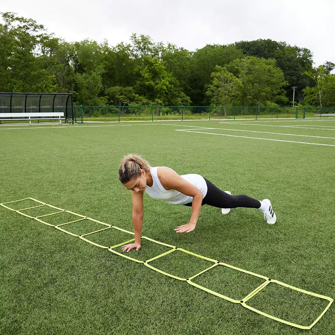 Rectangular ladder construction helps keep ladder stay aligned during exercise and prevent unwanted movement Rectangular construction also allows for easy storage and setup without tangling from traditional agility ladders Hook and loop connection allows for sections to be separated or combined to customize workout. Designed to improve agility, quickness, & acceleration.