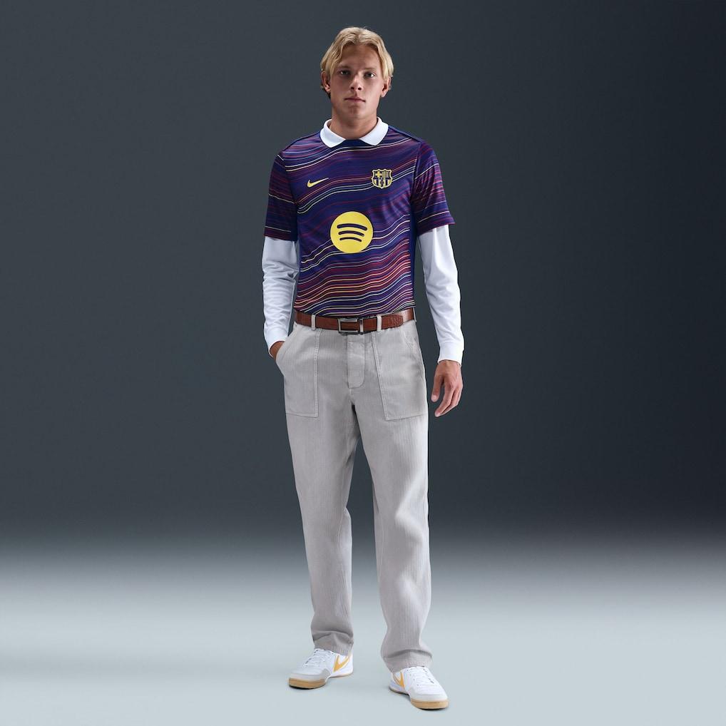 Get ready to rep your favorite club with this Barcelona 2025/26 Academy Pro Pre-Match Top from Nike. This top features a lightweight knit fabric with a slim fit that's snug and tailored across the chest, shoulders, and body for a modern look. The heat-sealed graphics and embroidered fabric applique highlight your team pride with eye-catching detail. Engineered with Dri-FIT® technology, the breathable fabric wicks away moisture to keep you cool and dry. Whether you're heading to the pitch or watching from home, this jersey is a must-have for showing your support for Barcelona.