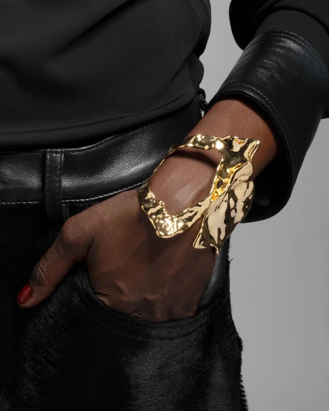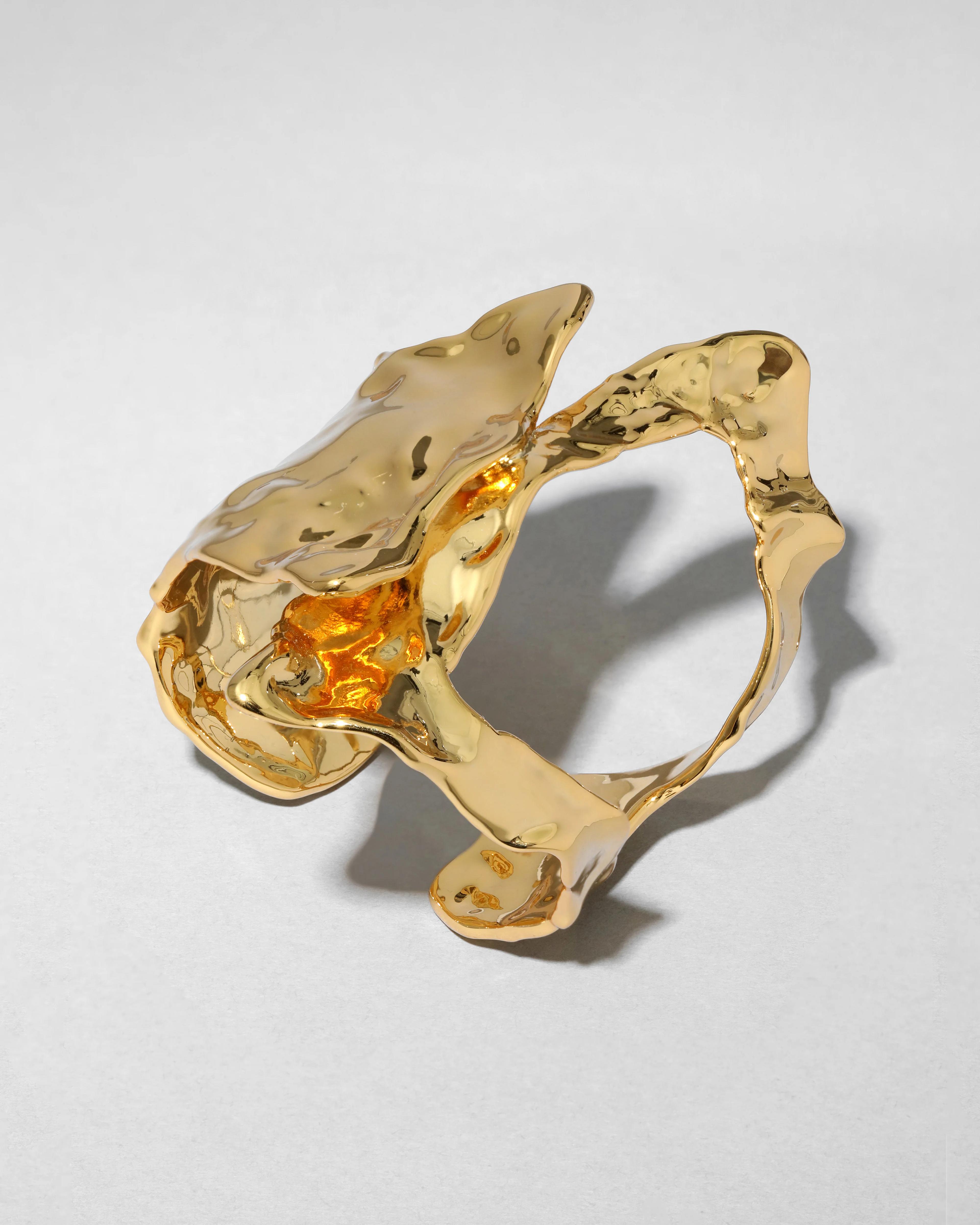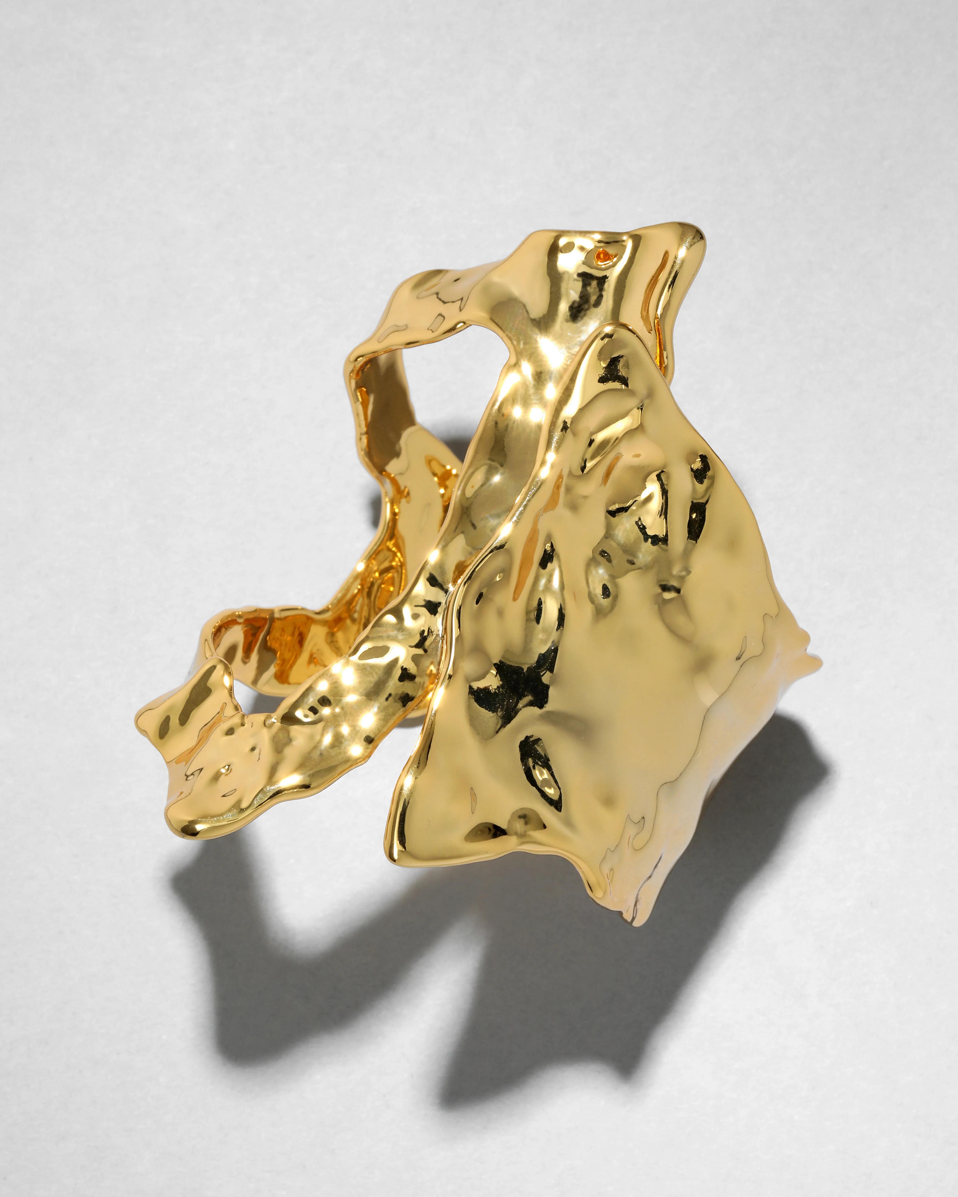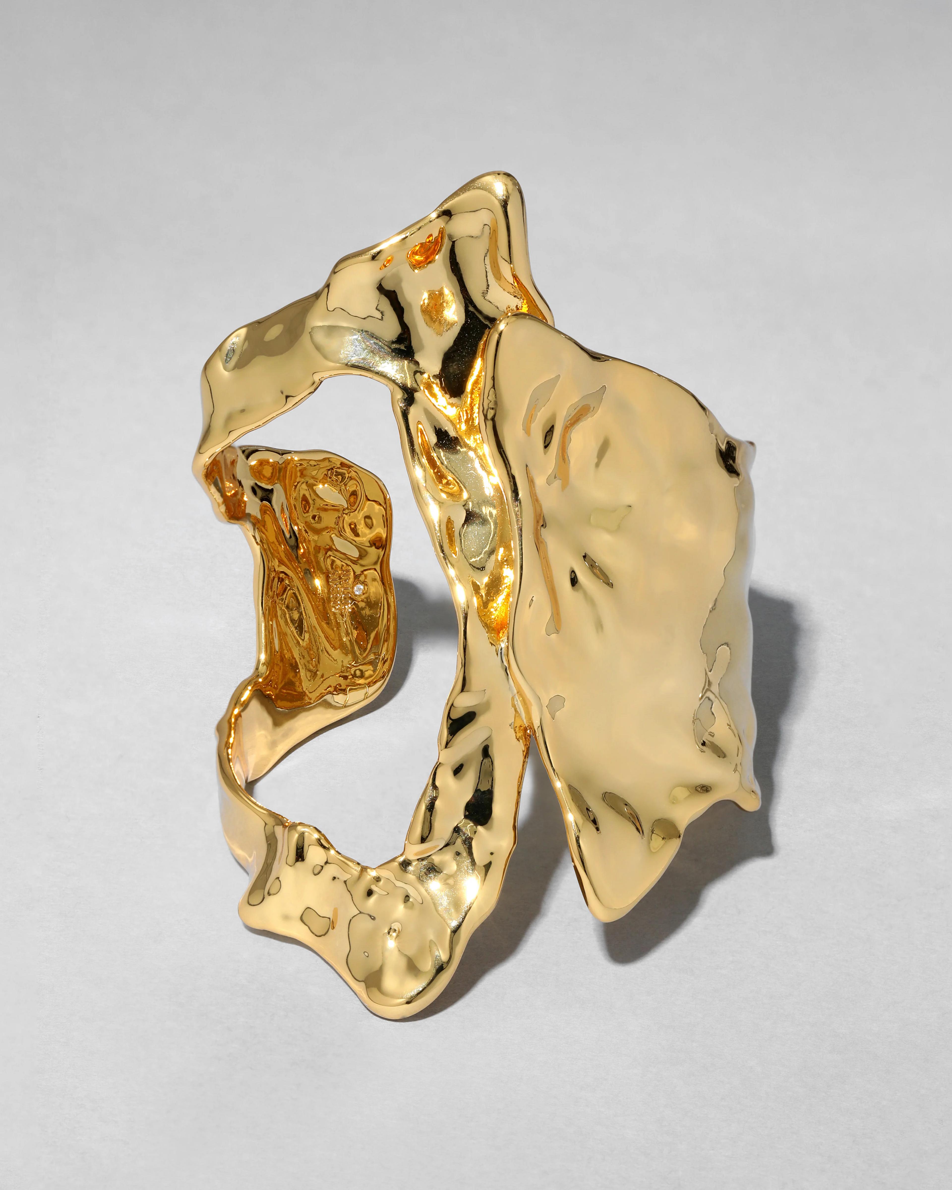 Details Striking & bold, this Brutalist inspired 14k gold plated cuff has an angular asymmetrical open silhouette that plays with volume and negative space. Finished with a molten slightly crumpled texture that captures light from every angle.