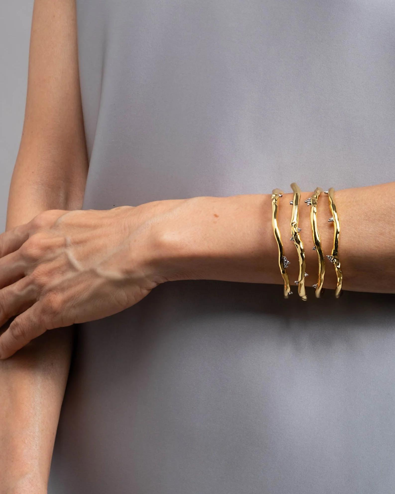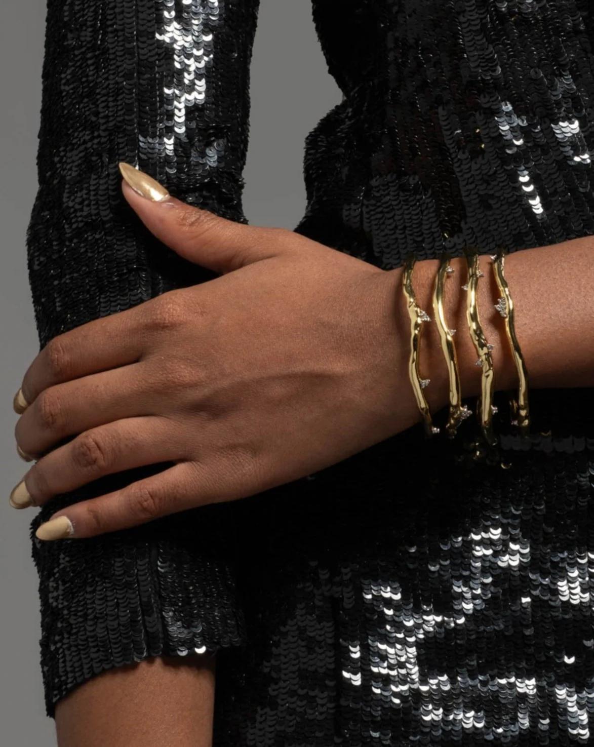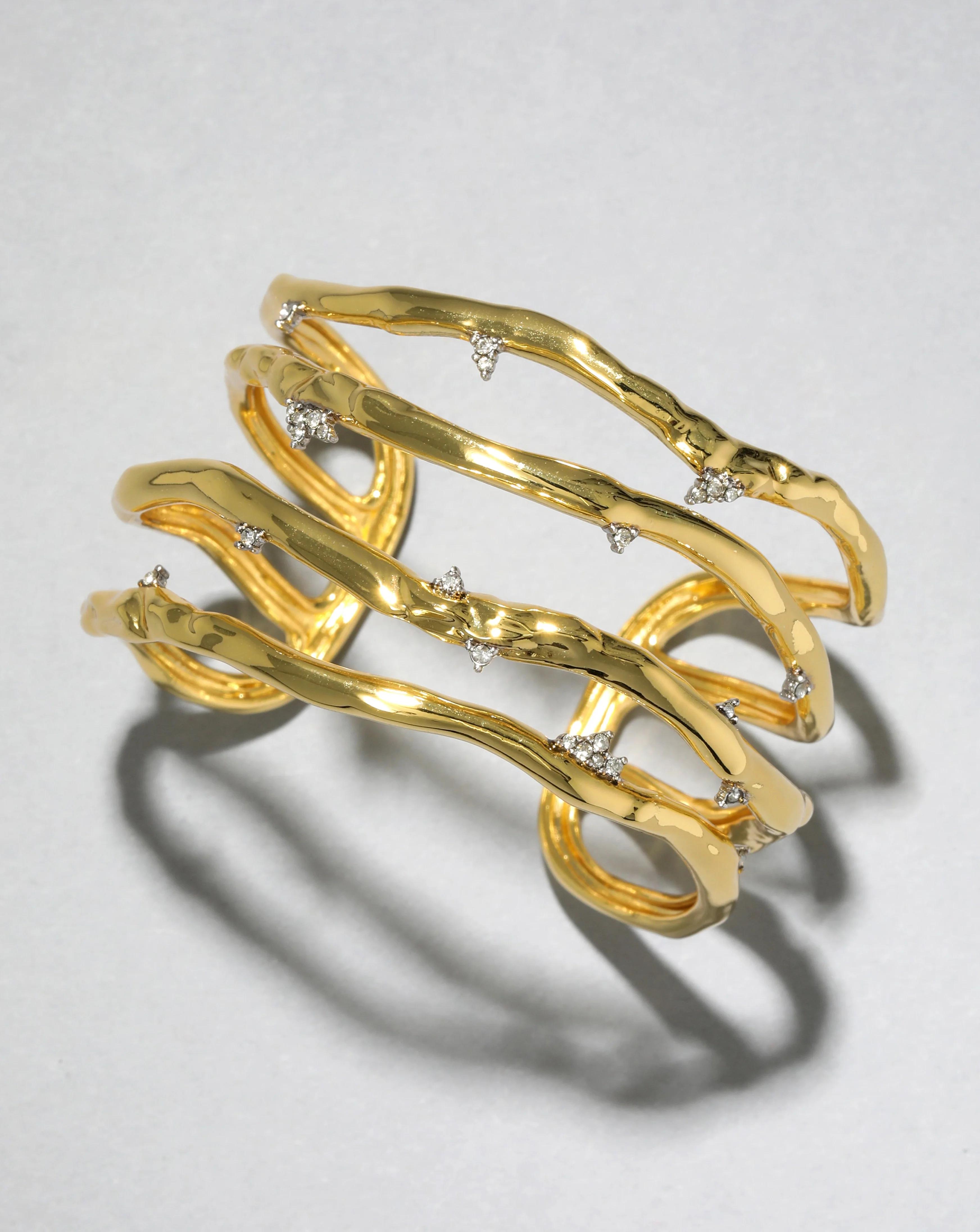 Details Molten 14k gold plated lines orbit the wrist from this Brutalist inspired cuff bracelet with an undulating sculptural silhouette thorned with custom cut crystal accents for a ultramodern opulent yet versatile look. 14k gold plated brass, rhodium tone plated brass, crystal UPC: 889519128753 Measurements 2.25" inner diameter, 1.75" north/south Care To clean, gently wipe the surface with a soft cloth.