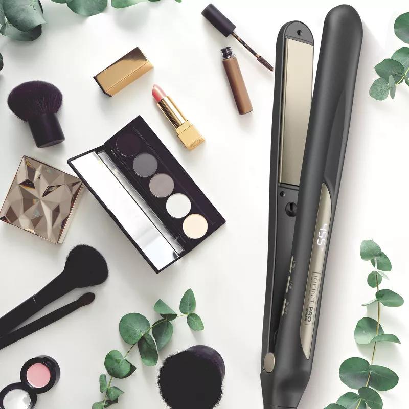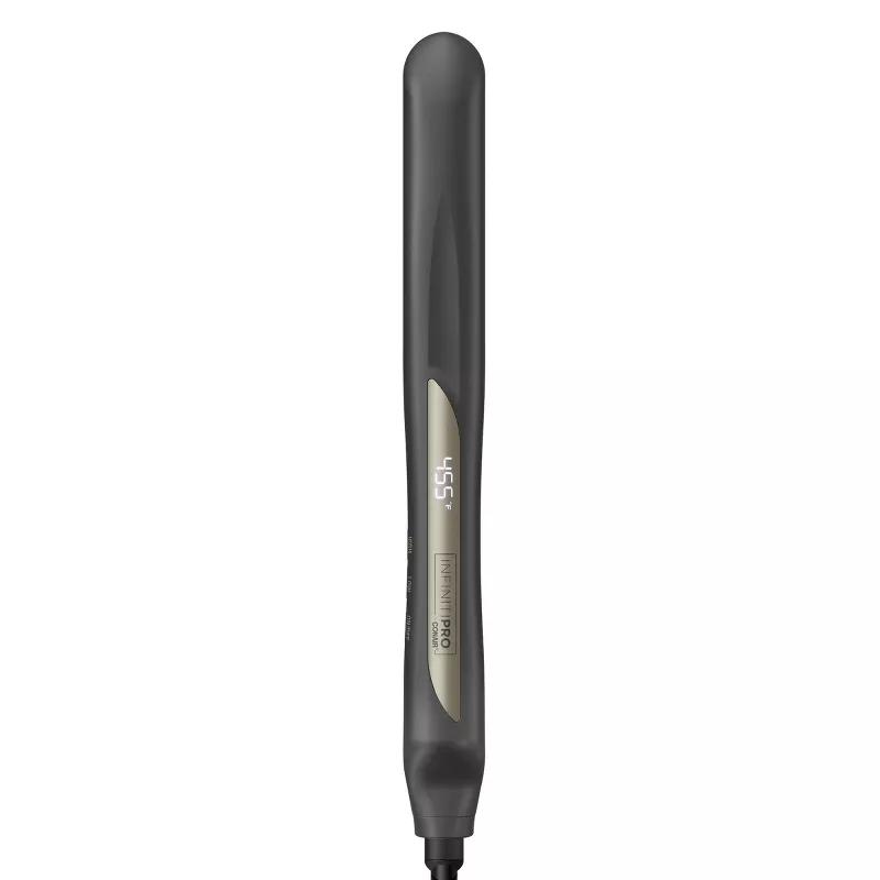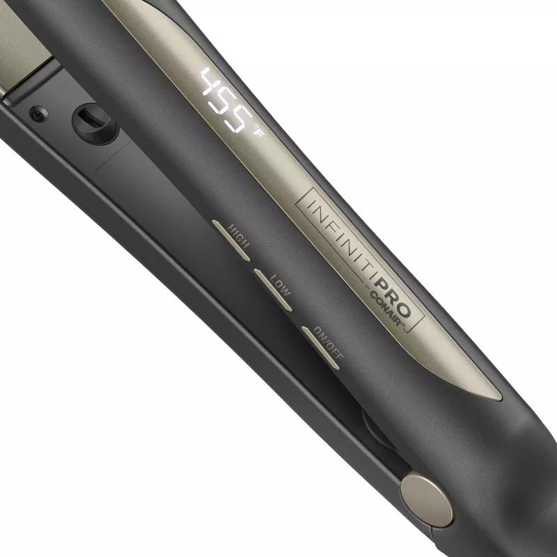 Smooth and shine. Straighten or curl. Get polished, professional results. Do it all, quickly and easily, with the InfinitiPRO by Conair® 1" Tourmaline Ceramic Flat Iron. Designed with a floating plate that adjusts to your hair's texture, this styling essential features ionic technology to reduce frizz and give you shiny, manageable results with just one pass. The true ceramic heater heats up in 30 seconds and generates consistent heat for a flawless finish as soon as it reaches a stabilized temperature. The temperature select buttons and digital LED display make it easy to customize heat for your hair type. Choose from 5 heat settings up to 455°F. With such a wide range of heat options, there's a setting for every hair type and texture. The InfinitiPRO by Conair® 1" Tourmaline Ceramic Flat Iron combines ease of use with sophisticated technology to make you look like you just stepped out of the salon every time you use it. Tourmaline ceramic provides an easy-glide, easy-to-clean surface on the plates to smooth down flyaways and deliver even heat for the ultimate in shiny, silky, healthy-looking hair. The floating plate ensures better contact with hair and eliminates gaps for perfect smoothness and shine. This innovative flat iron has an advanced ion generator that produces 50% more frizz-fighting ions than other stylers to boost shine and banish frizz, flyaways and static electricity. You control the temperature depending on your hair type—the thicker the hair, the higher the heat, up to 455°F. Superior heat transfer lets you create sleek, straight styles and flawlessly formed curls that last. Get professional results at home with this ultra-versatile styler from InfinitiPRO by Conair.®