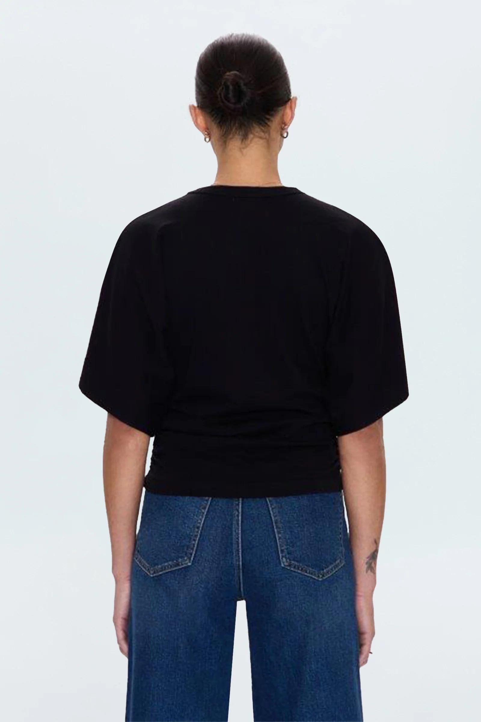 The perfect tee for the season. Veronica delivers a relaxed dolman shape with drop shoulders that transitions to a fitted silhouette through side cinching. The bodycon effect feels intentional, while the shirttail hem adds subtle movement. Crafted from a 100% cotton compact jersey that holds its shape and feels luxuriously soft against the skin. Noir brings timeless black sophistication that elevates any look, great for layering or standing alone.