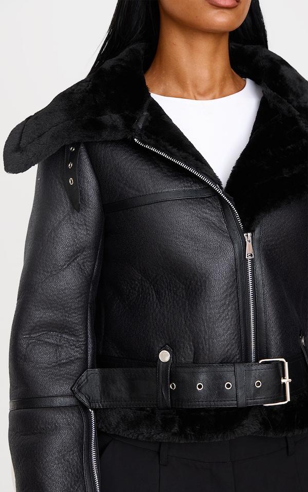 An investment piece with contemporary edge. This cropped aviator jacket in classic black redefines the iconic silhouette with a confident, modern spirit. Multiple zip details add a tactile dimension and a hint of utility cool to this otherwise streamlined design. Crafted for a tailored yet comfortable fit, the cropped length makes it ideal for layering. Style yours over a ribbed knit and pair with wide-leg tailored pants from our bottoms collection for a directional take on everyday dressing.