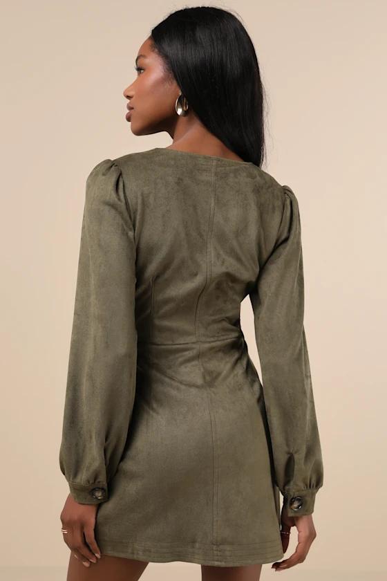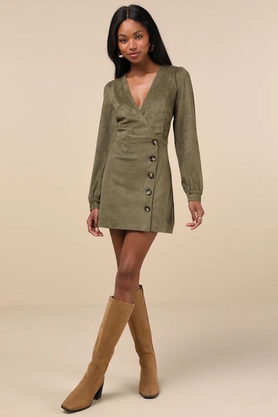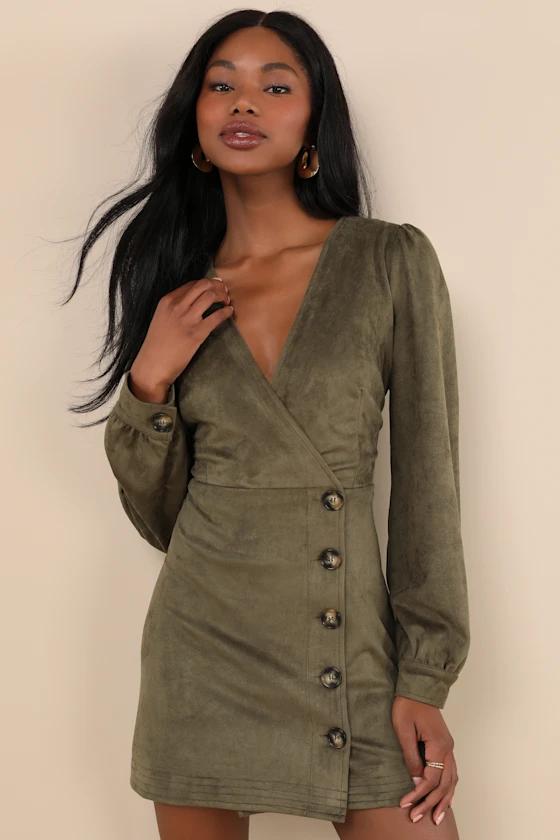 The Lulus Chicest Aura Olive Green Suede Surplice Long Sleeve Mini Dress will become your signature way to look stylish all fall long! Soft faux suede shapes this sweet dress that features a flirty surplice neckline and long sleeves with gathering at the shoulders and button cuffs. The wrap silhouette boasts a fitted waist (that secures with an internal button closure) and an A-line mini skirt with a functional button placket along the side.