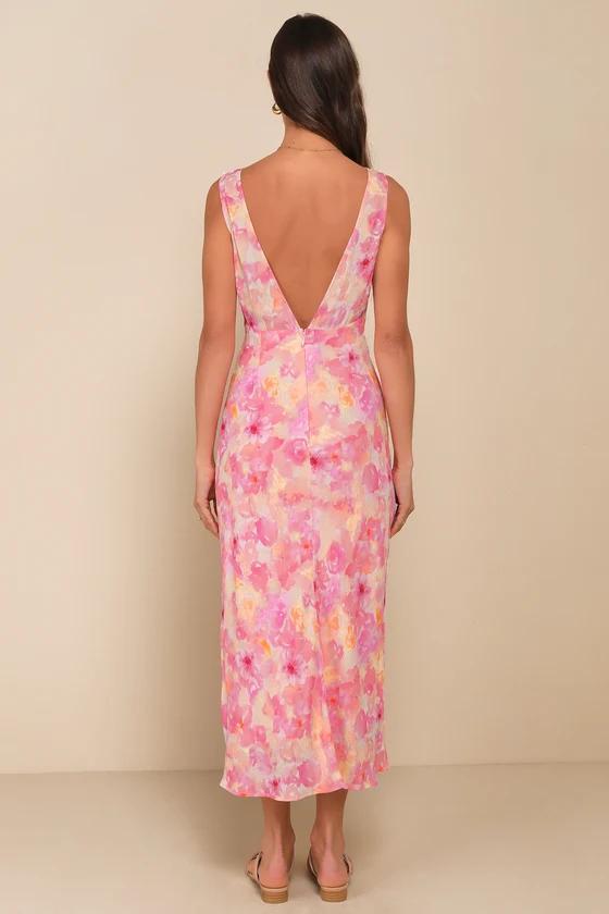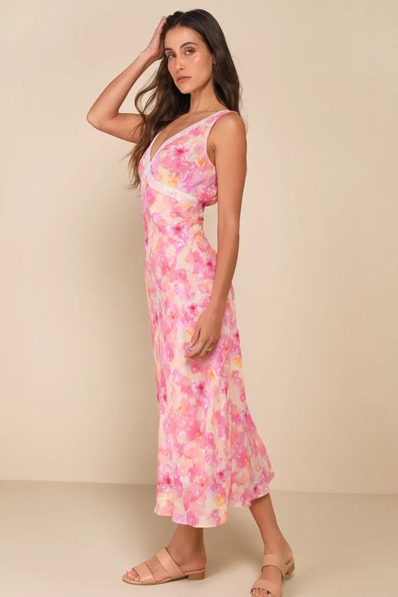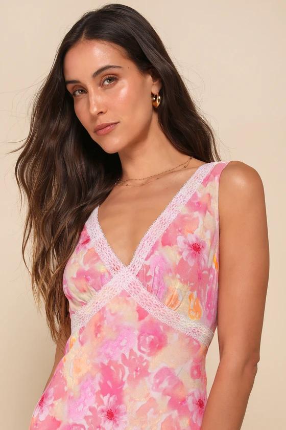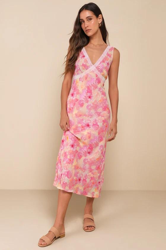 Timeless and seriously sweet, the Lulus Picture-Perfect Days Pink Multi Floral Lace V-Neck Midi Dress will make sure you look good from every angle! Lightweight, crepe woven fabric features a pink, light orange, and ivory floral print throughout as it shapes this sweet dress with a deep, lace-trimmed V-neckline and a sleeveless bodice. High, empire-style waist tops a figure-skimming, slip silhouette that continues down to the chic midi hem. Deep V-back lends a flirty finish! Hidden back zipper/clasp.