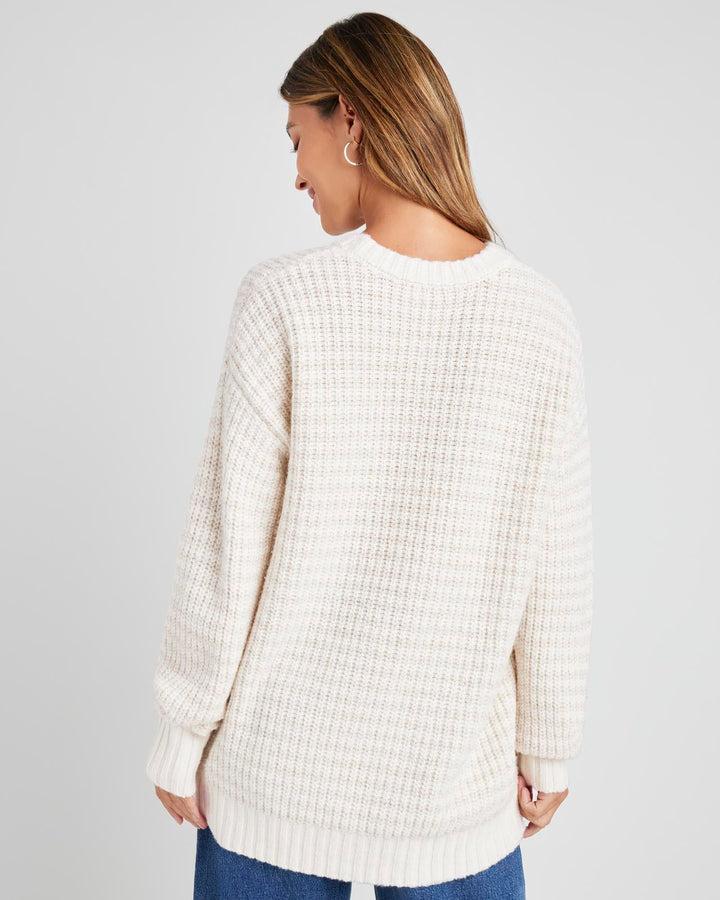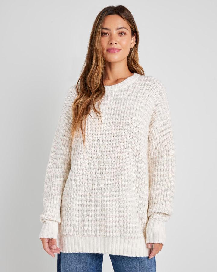 Add a hint of sparkle to your everyday in our Brielle Sweater. Made from a knit blend with a stripe design that features lurex yarns for a subtle shimmer finish. Its cozy crewneck silhouette has a drop shoulder for a comfy oversized fit framed by thick rib trim along the neckline, sleeve cuffs and hem. Knit blend with lurex yarns for subtle sparkle.