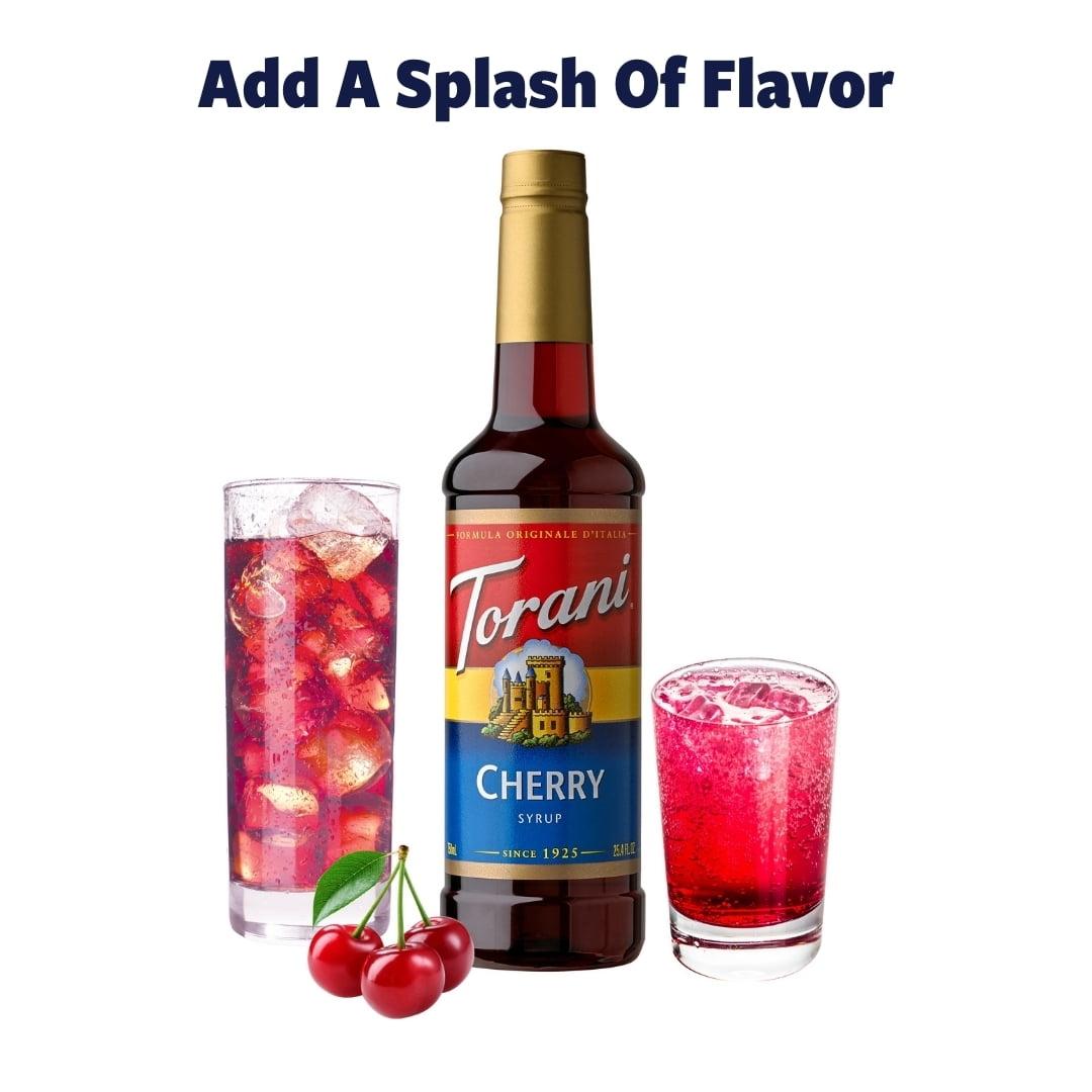 ring the sweet, tempting taste of fresh summer cherry to your drinks with this Torani Cherry flavoring syrup. This cherry flavoring for coffee is a syrup will add the bold taste of cherry to your drinks without being too strong or too sweet. This Torani cherry drink syrup delivers the complex flavor of fresh cherries into your favorite drinks and desserts. The taste of fresh-picked red cherries provides a delicious addition to any drink. With its eye-catching red color, you can use this cherry syrup for drinks for iced teas, lemonades, cherry snow cones, sparkling waters, handcrafted sodas, Italian sodas, smoothies, cherry cocktails, mocktails, and more.