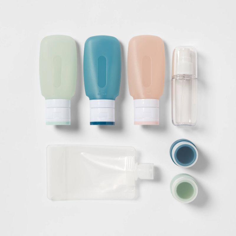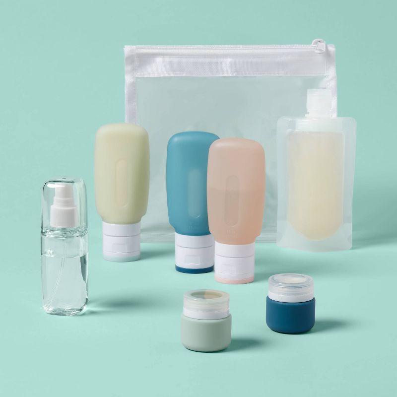 Organize your toiletries for travel with this 8-Piece Travel Container Set from up&up™. This TSA-compliant travel set includes a transparent pouch with zipper, three squeeze tubes, two small jars, one spray bottle and a small plastic pouch. Silicone travel bottles are unsuitable for oils, alcohols, hair serums, salicylic acid, hydrogen peroxide, or any caustic, corrosive, or flammable products up&up™: We believe making smart choices for the people, places, and pets in your life should be easy and affordable. And, having quality you can trust should be a given. That’s why you can count on our promise – caring for your everyday in every way. Satisfaction guaranteed – Love it or your money back.